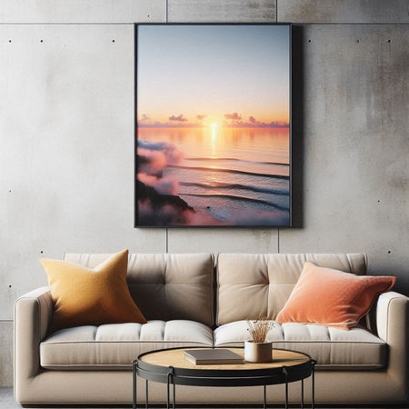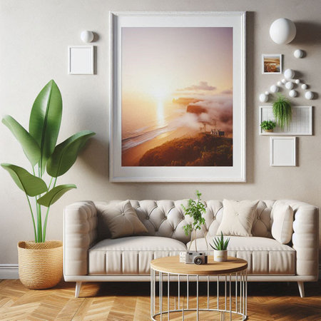 A contemporary living room with a framed photograph of a mountain sunset on a gray wall. The room is decorated with a beige sofa, a wooden coffee table, and two lamps. There is a plant on the floor and a window with a view of trees.