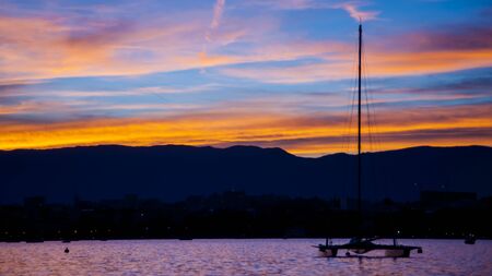 Twilight vibrant colorful sky above sea and mountain sihlouette at dusk time.