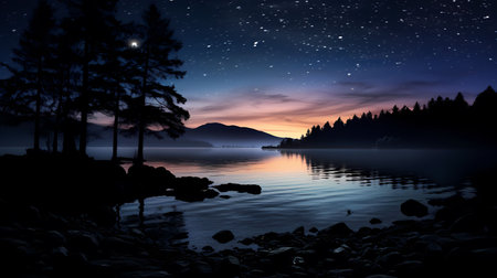 Beautiful night landscape with lake, forest and starry sky.