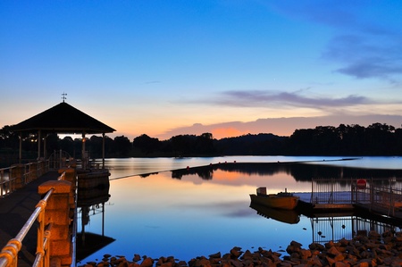 Colourful sunset and the reflection on Lower Pierce reservoir (Singapore), with a gazebo, boat and jetty as foreground