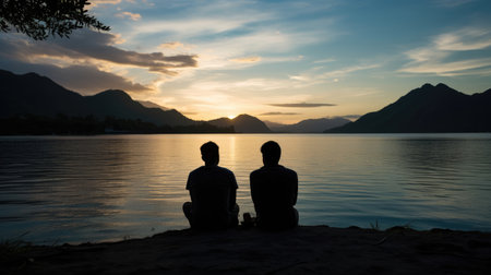 Friends meditate by lake.
