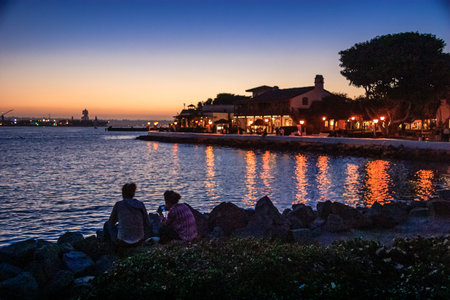 people silhouette promenade in evening time on dock waterfront district with dark sea horizon background with empty copy space for your text