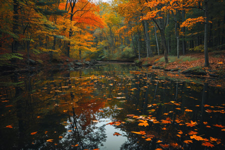 Vibrant fall foliage reflects on the still waters of a forest lake, creating a tapestry of autumn colors in a tranquil natural setting. Resplendent.