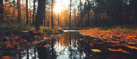 a stunning nature fall wallpaper captured with a canon eos 5d mark iv, showcasing the vibrant red and amber hues of autumn. this hyper-realistic image, reminiscent of the style of unreal engine 5, portrays serene solitude and a joyful celebration of nature. a national geographic-worthy photo featuring mesmerizing water elements. ai generated