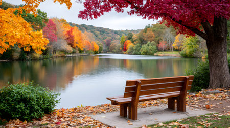 Park bench overlooking a calm lake with colorful autumn trees reflecting in the water