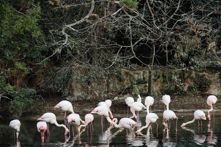 Pink flamingos on the lake. Kyiv zoo. The concept of peaceful life in Ukraine.