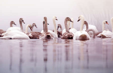 A Swans gracefully swim on misty lake at sunrise, creating serene scene