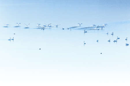 A dynamic aerial view of a flock of swans taking off from a serene water surface, capturing the beauty and motion of wildlife in nature.