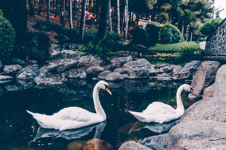 A pair of white swans swimming in a dark pond surrounded by rocks and forest
