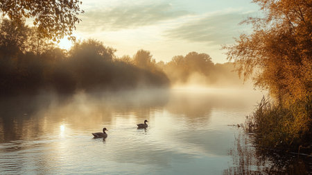 Ducks swimming on the lake at sunrise. Beautiful autumn landscape.