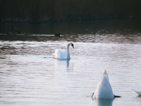 Two white swans swimming in the lake at sunset. Beautiful romantic couple of swans on the lake.