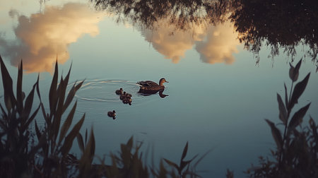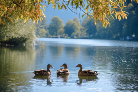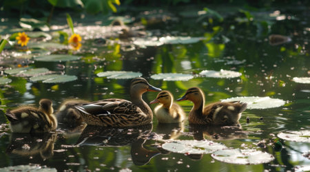 Mallard ducks swim in tranquil pond water generated by artificial intelligence