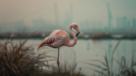 A stunning scene featuring elegant pink flamingos standing gracefully in a misty landscape at dawn. The calm water reflects their beauty, creating a tranquil atmosphere.