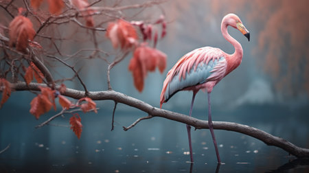 pink flamingo perched on a tree branch in the water, showcasing whimsical and eerie animal symbolism. this photo, rendered with vray tracing, captures photo-realistic landscapes in light blue and crimson hues. the stunning 8k resolution highlights the beauty of the realistic landscapes, featuring soft, tonal colors. ai generated