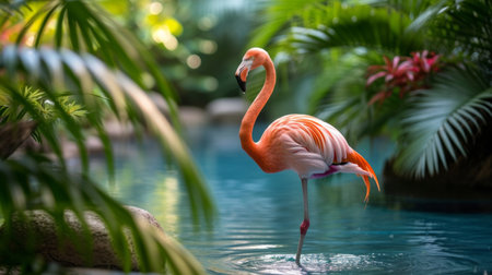 A beautiful pink flamingo walks near a blue pool. Tropical plants around.