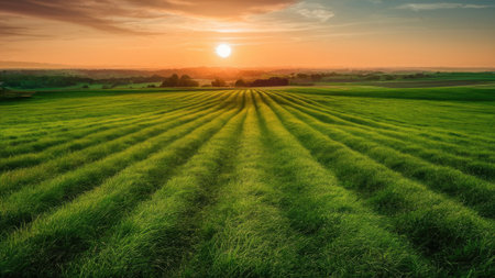 A picturesque landscape showing a vast green field with rolling lines under a vibrant sunset sky.
