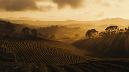 Captivating landscape of rolling hills and vineyards under a stunning sunset. The golden light illuminates the serene scene, evoking tranquility.
