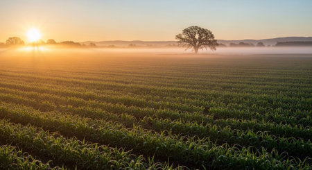 The warm, golden light of a sunrise breaks through a gentle morning mist, casting long rays across an expansive agricultural field. The field is planted with neat rows of green crops, and in the distance, a solitary, oak tree stands silhouetted against the hazy horizon. The scene evokes a sense of peace and natural beauty at the start of a new day.