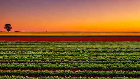 A vast agricultural landscape bathed in the warm glow of a sunset. In the foreground, meticulously planted rows of lush green crops stretch towards the horizon. A distinct band of red earth or a different crop separates the green fields from a distant, golden-hued field. A solitary, dark tree stands silhouetted against the vibrant orange and purple sky, emphasizing the expansive and peaceful nature of the scene.