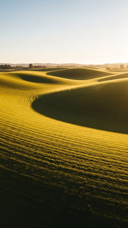 Creating showing golden rolling hills of a cultivated field bathed in warm sunlight creating dramatic shadows and highlighting curved patterns. resolution...