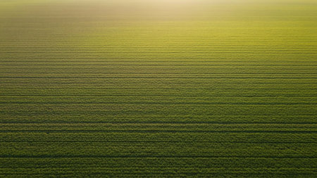 An aerial view of a vast green agricultural field displaying perfectly straight horizontal rows under a softly lit, hazy sky.