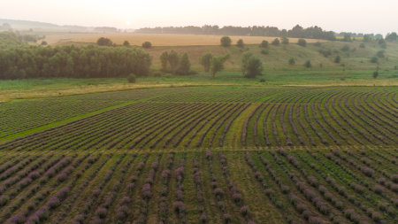 Capturing the breathtaking symmetry of crop rows, this aerial view showcases a lush agricultural landscape. The setting sun casts a warm glow over the fields, highlighting nature's artistry.