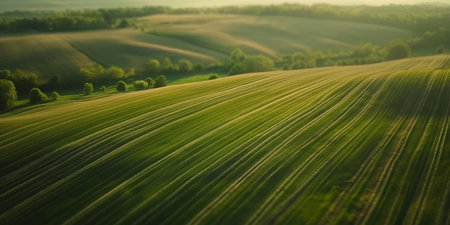 Golden hour sunlight bathes vast rolling green agricultural fields, highlighting distinct tractor tracks that form a textured pattern across the undulating landscape.