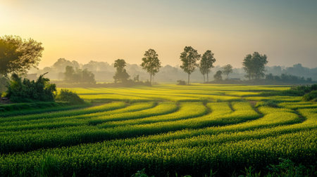 Rural Punjab at dawn, beautiful mustard fields shining under the early morning light generative ai