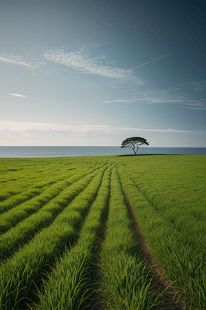 Green rice field with tree and blue sky background, 3d render