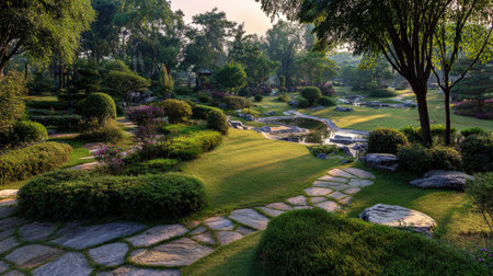 Landscape design with green, mown lawn, flowers, bushes, and stones harmoniously integrated into the surrounding environment, creating an atmosphere of tranquility and contemplation. Copy space for text.