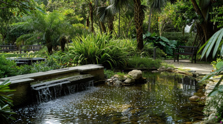 This captivating image features a tranquil garden pond adorned with vibrant water lilies, surrounded by lush tropical foliage, creating a serene retreat in nature.