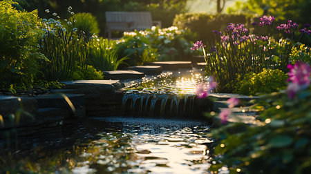 Tranquil garden scene featuring a stream with stone steps, vibrant purple flowers, and the warm glow of sunlight reflecting on the water's surface. Lush greenery surrounds the scene.