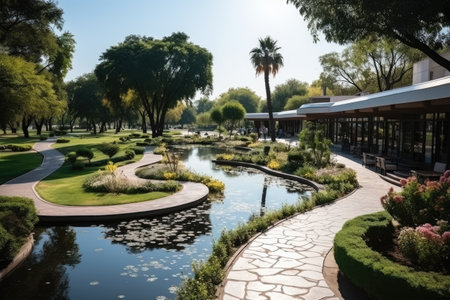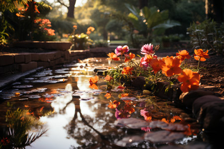 A stunning photo of a garden pond surrounded by lush greenery and colorful flowers