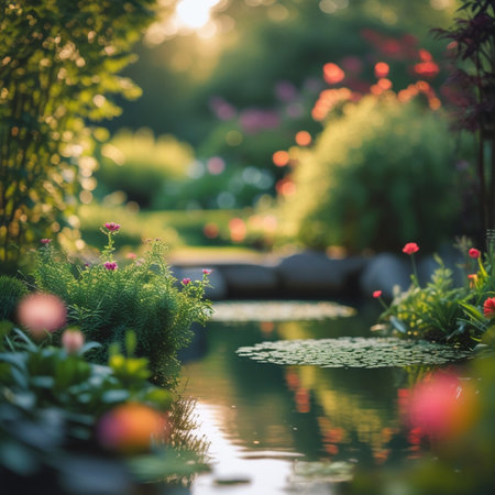 A tranquil garden scene showcasing lush greenery surrounding a serene pond. Soft reflections on the water create a peaceful atmosphere perfect for relaxation.