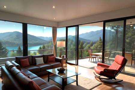 The modern living room interior design with large windows providing mountain and lake