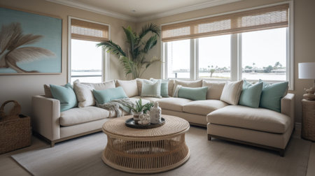 Interior design of Living Room in Coastal style with Ocean View decorated with Natural Fibers, Coastal Accents material. Coastal architecture. Generative AI AIG24.