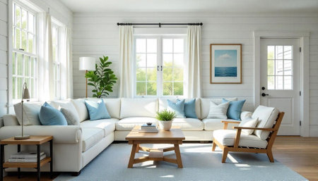 Bright coastal living room with comfortable white sectional sofa