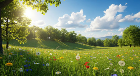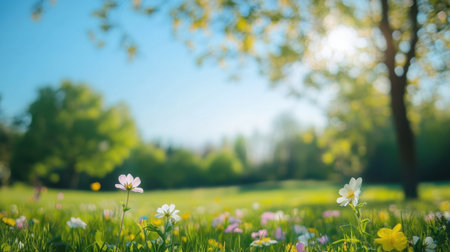 A tranquil spring meadow showcasing a vibrant array of wildflowers under a clear blue sky, with sunlight filtering through lush green trees, creating a serene natural atmosphere.