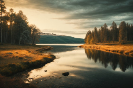 AI Generated. Serene Sunset Over the Tranquil Lake and Shoreline