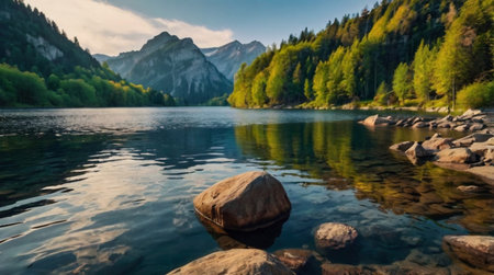 Mountain lake in the forest. Beautiful summer landscape with forest lake