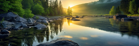 A stunning scene of a calm river reflecting a colorful sunset, surrounded by vibrant forests and mountains. The soft light creates a tranquil atmosphere perfect for relaxation.