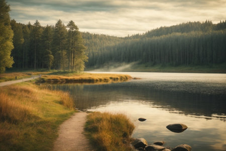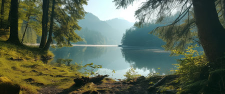 Calm lake reflecting the serene beauty of a mountain landscape and lush forests in a tranquil morning setting