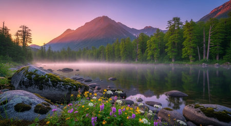 Serene mountain lake reflection at sunrise with vibrant wildflowers