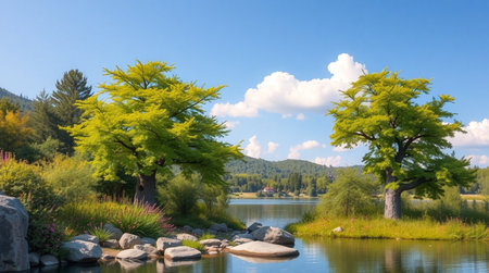beauty of a tranquil lake, surrounded by lush greenery and mirrored reflections. Generative AI