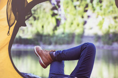 Man relaxing in camping tent at lake shore. Travel, adventure, wanderlust concept
