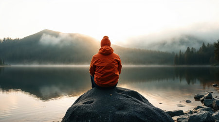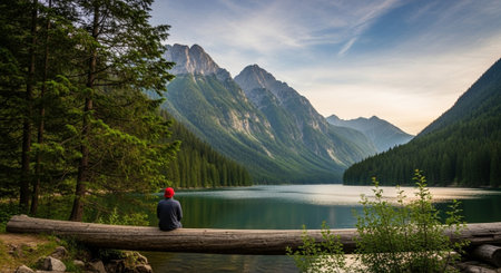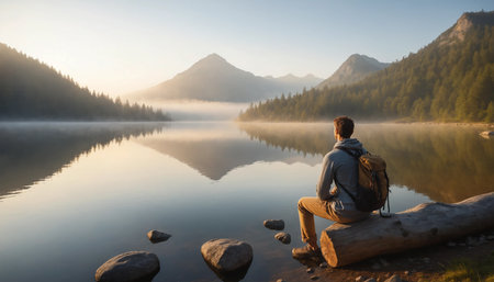 Man sitting on a log on the shore of a mountain lake at sunrise ai generated.“This image was created using generative artificial intelligence tools