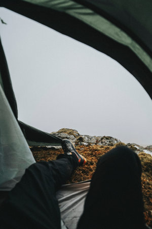 Generative AI : POV view of hipster tourist inside tent in front of mountains landscape Adventure hiking and wanderlust concept