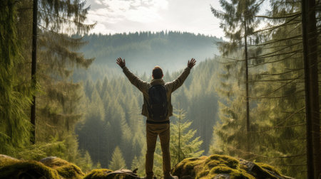 Male hiker, full body, view from behind, standing in a coniferous forest with raised arms, hands clenched into fist - Generative AI