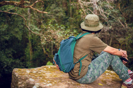 teen girl backpack stay and sitting on nature cliff with forest lanscape background, adventure trip tourism, holiday vacation with travel to moutain