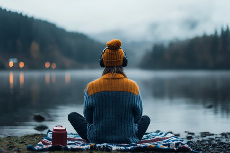 A person sits cross-legged on a colorful blanket by the tranquil lake, wearing headphones and a cozy sweater. Soft twilight reflects on the water, enhancing the calm atmosphere.